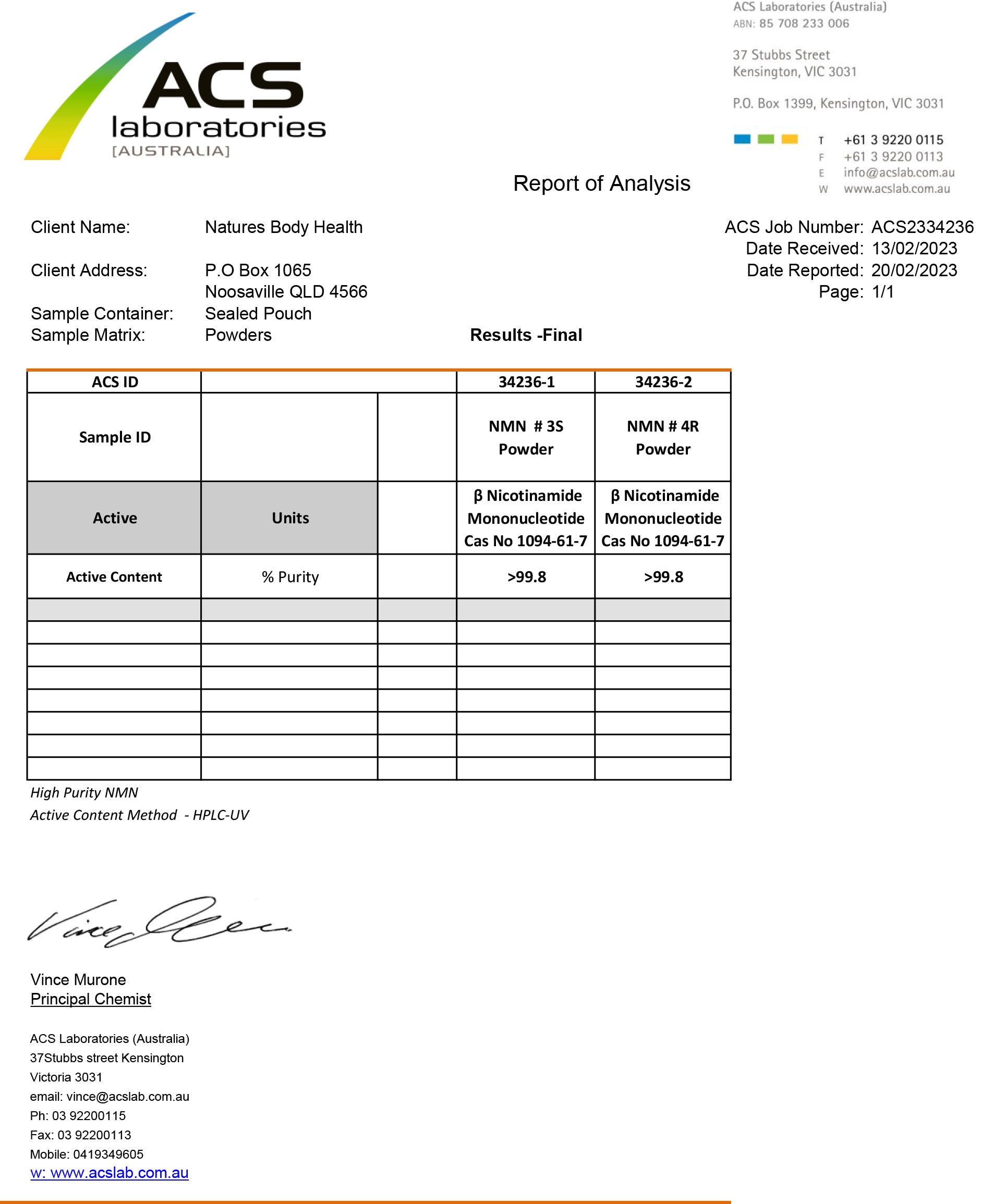 NMN 100% Pure & Stabilised (60 Capsules X 500mg) Third Party Tested